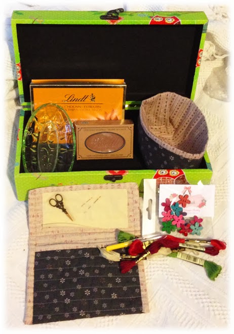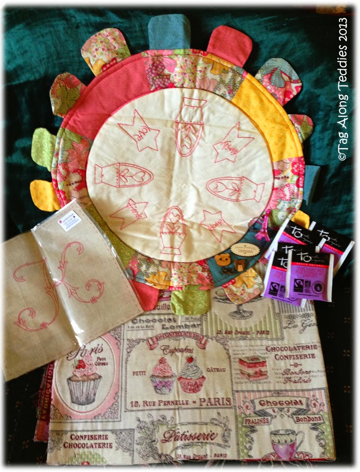 Just look at all those goodies!! Florence must have been reading my blog and making a list of my favourite things ... cos she's included so many of them! :0) Do you see that GORGEOUS table mat/centrepiece at the back ... the colours are so sweet and look perfect in our shabby chic decorated lounge room. The stitching in the centre is so beautifully neat!! If you take a peek on the blue patch at the bottom right of the table mat, you'll see some sweet timber buttons just waiting for the perfect project to show them off. There's also a cute Eiffel Tower key ring there ... not only is Florence from France, she knows I love so much about France! :0) There's some lovely teabags ready for me to play Polly and enjoy them while I'm stitching - YUM! And look at that FABRIC!!! Oh Florence! You HAVE spoilt me!!! I'm going to make myself a simple tote bag with it to show off the GORGEOUS designs. It's a fabulous, heavy brocade type fabric, so will be perfect for carrying lots of sewing goodies when I run away from home for a sewing day. Then there's the FABULOUS monogram ready for me to stitch ... I think that will either be a pocket for my new tote or maybe the front flap of a special sewing project pouch to pop inside. OH!!!! I have been so SPOILT!!! Thank you SOOOOOOOOOOOO much Florence!! You have been a wonderful secret Santa to me ... if I ever manage my dream of visiting France, I'll catch up with you to give you a big squooshy BEAR HUG in person!!! :0) MERCI MON AMI!!!